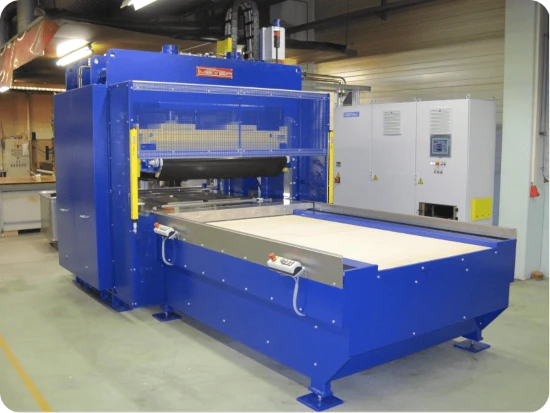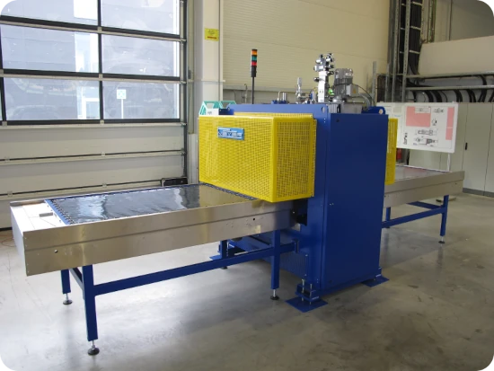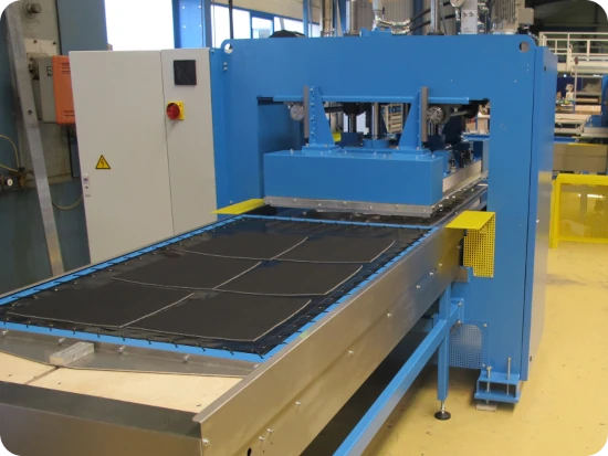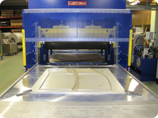 Diese hydraulische Prägepresse ist mit einem einseitigen Legewagen ausgestattet, auf dem das Prägewerkzeug montiert ist, und verfügt über eine integrierte Rückkühlstation.